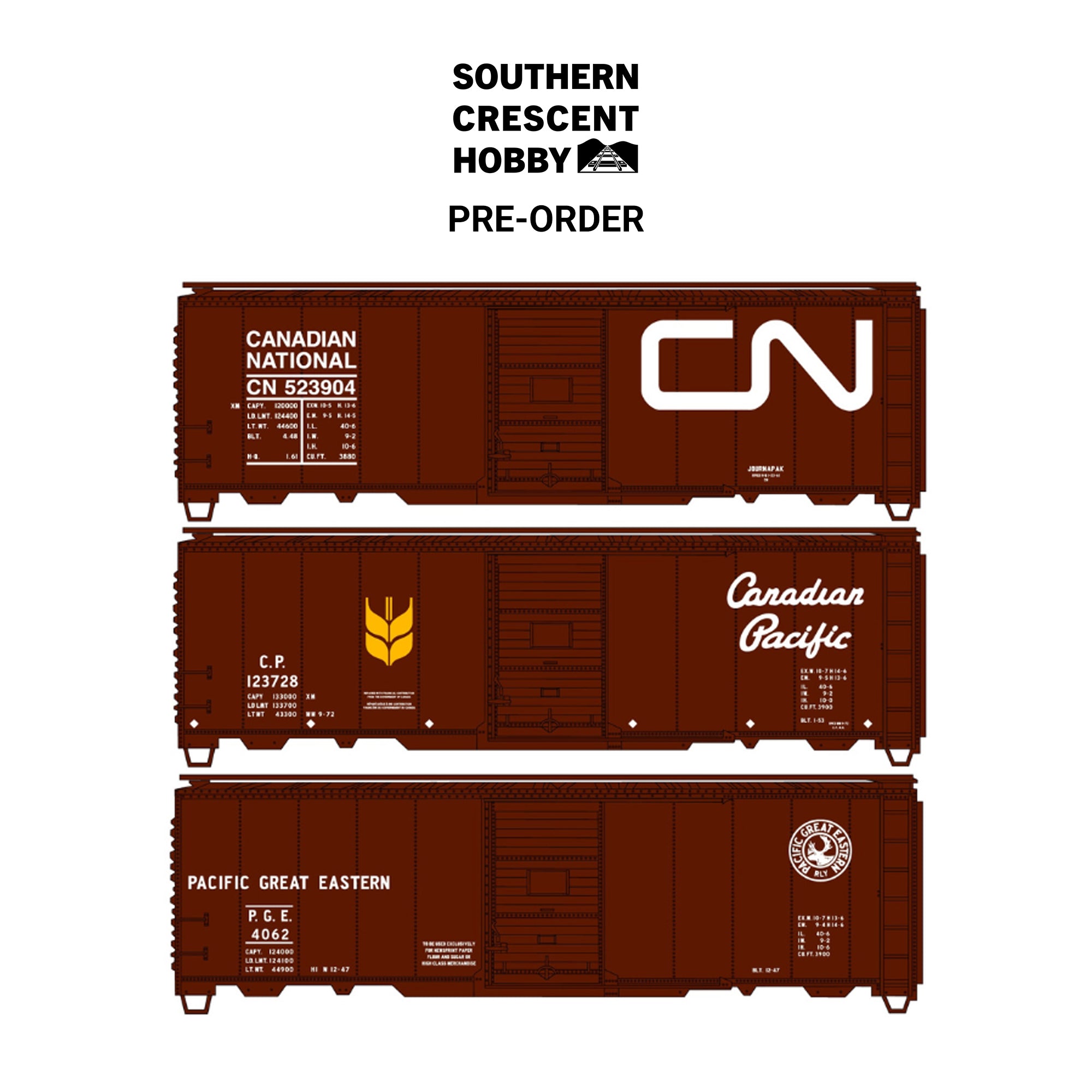 ![[PREORDER] Accurail 8193 HO 40' Riveted Steel Box Car Kit 3-Pack, CN-CP-PGE Canadian Road Limited Run](http://southerncrescenthobby.com/cdn/shop/files/accurail8193.jpg?v=1772768543&width=533)
