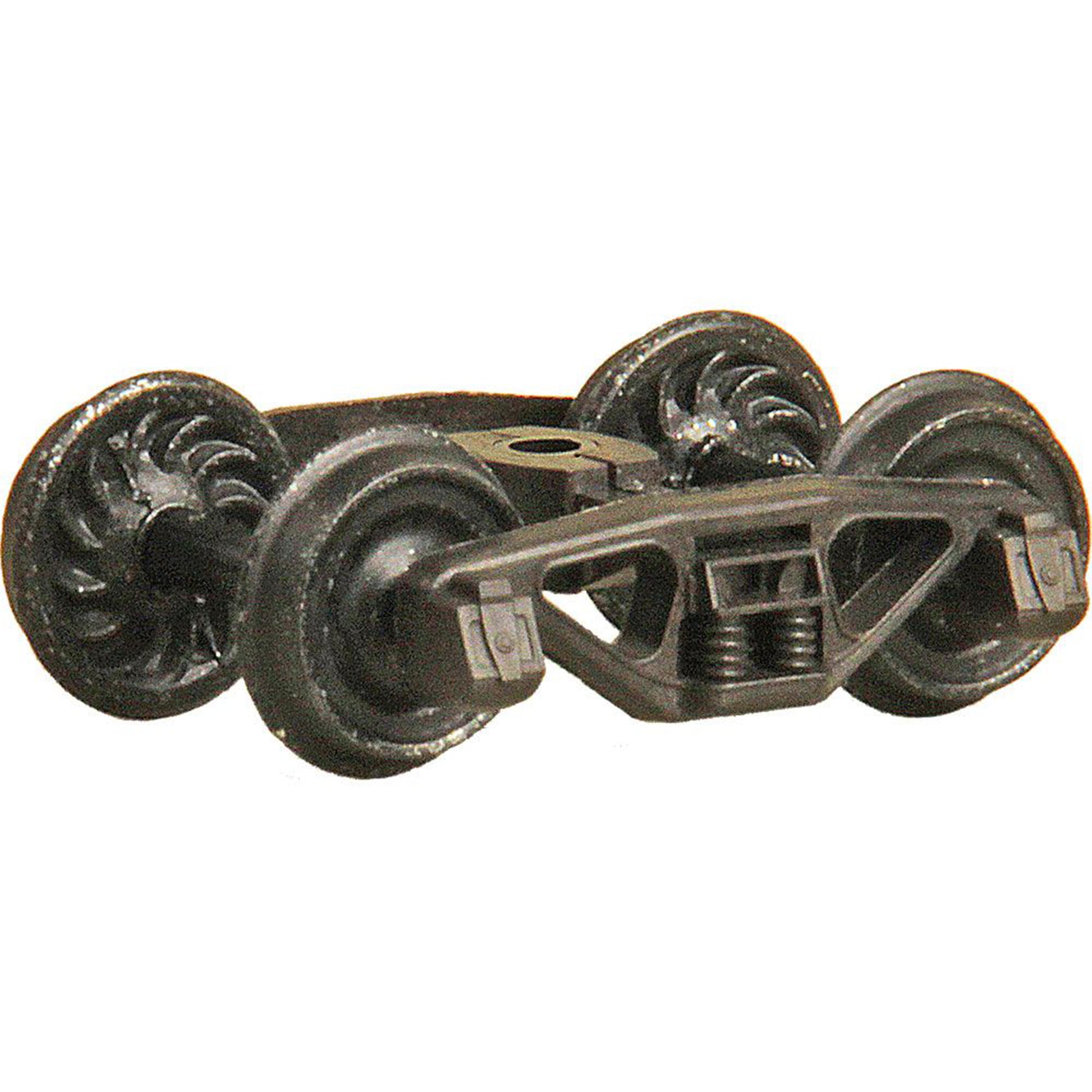These HOn3 trucks use the same "two piece" design and material as our HO scale "HGC" trucks. HGC means "High Gravity Compound" which is a high tech plastic/metal composite material. These are simple and easy to assemble and install. Once installed properly they will have a free rolling, flexible, equalizing ride similar to our #716 and #717 HOn3 fully sprung truck kits. Included are center bushing adapters for attaching the trucks to various makes of cars such as Blackstone® and Micro-Trains®. These trucks require a flat mounting surface and some models may require trimming and filing of the car's bolster to make a flat surface. The bushings are designed for the original screws or where appropriate 0-48 self-tapping, 0-80 machine screws, or 1mm to 1.25mm metric equivalent.