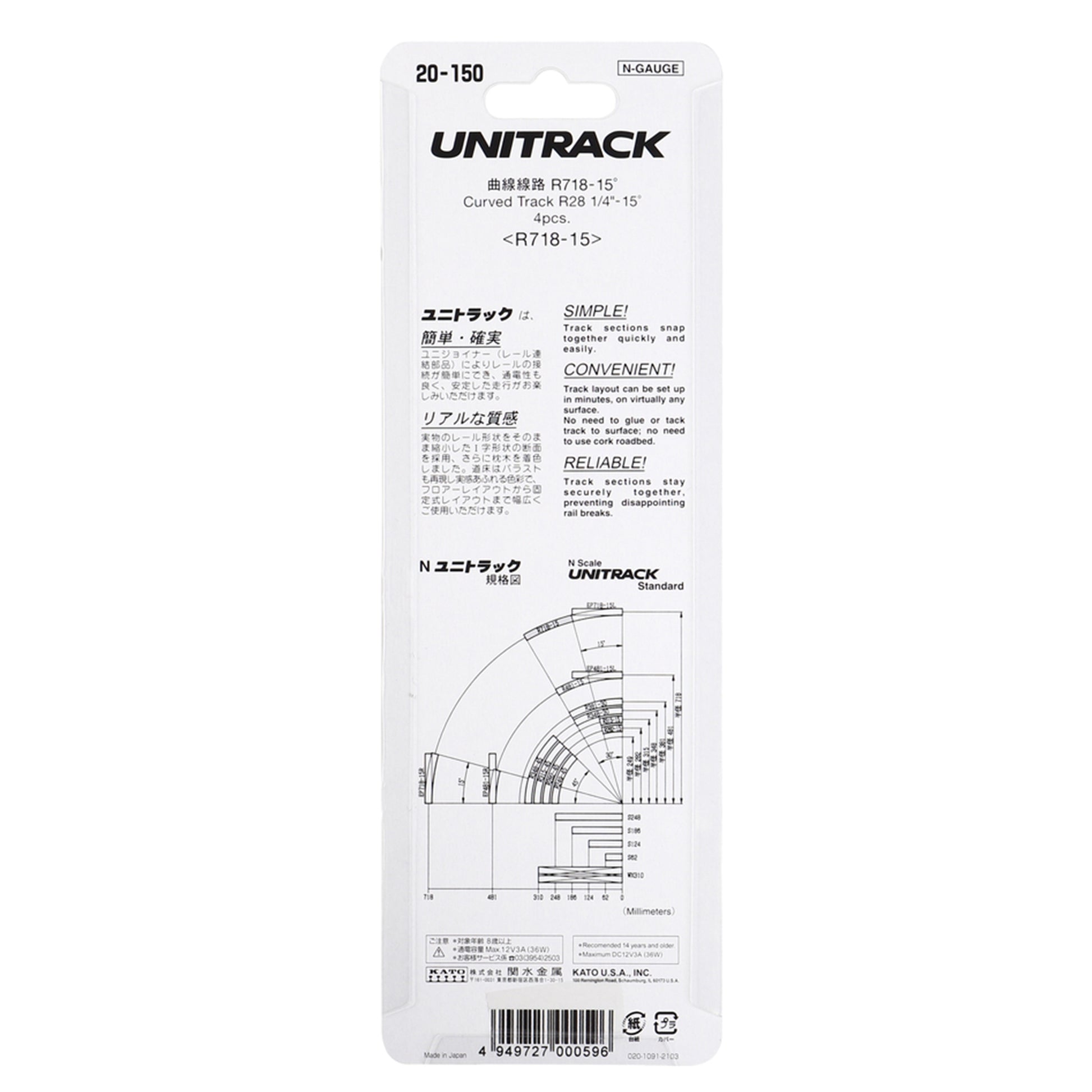 Kato N 20-150 Unitrack Curved Track 718mm (28-1/4") Radius 15-degree segment, 4pc