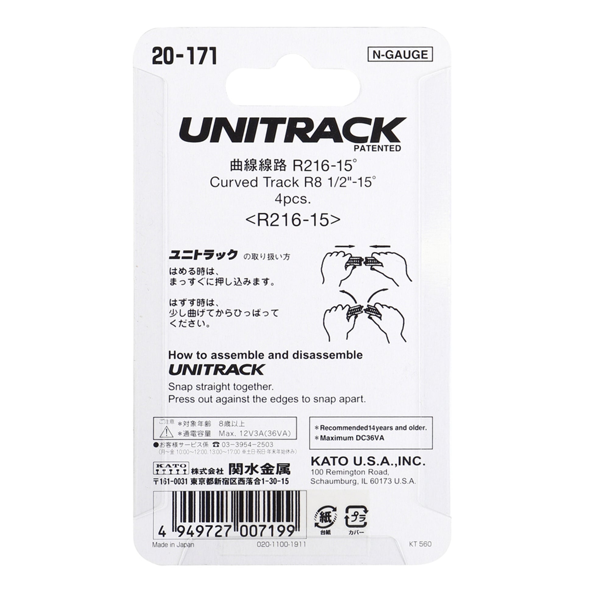 Kato N 20-171 Unitrack Curved Track 216mm (8-1/2") Radius 15-degree segment, 4pc