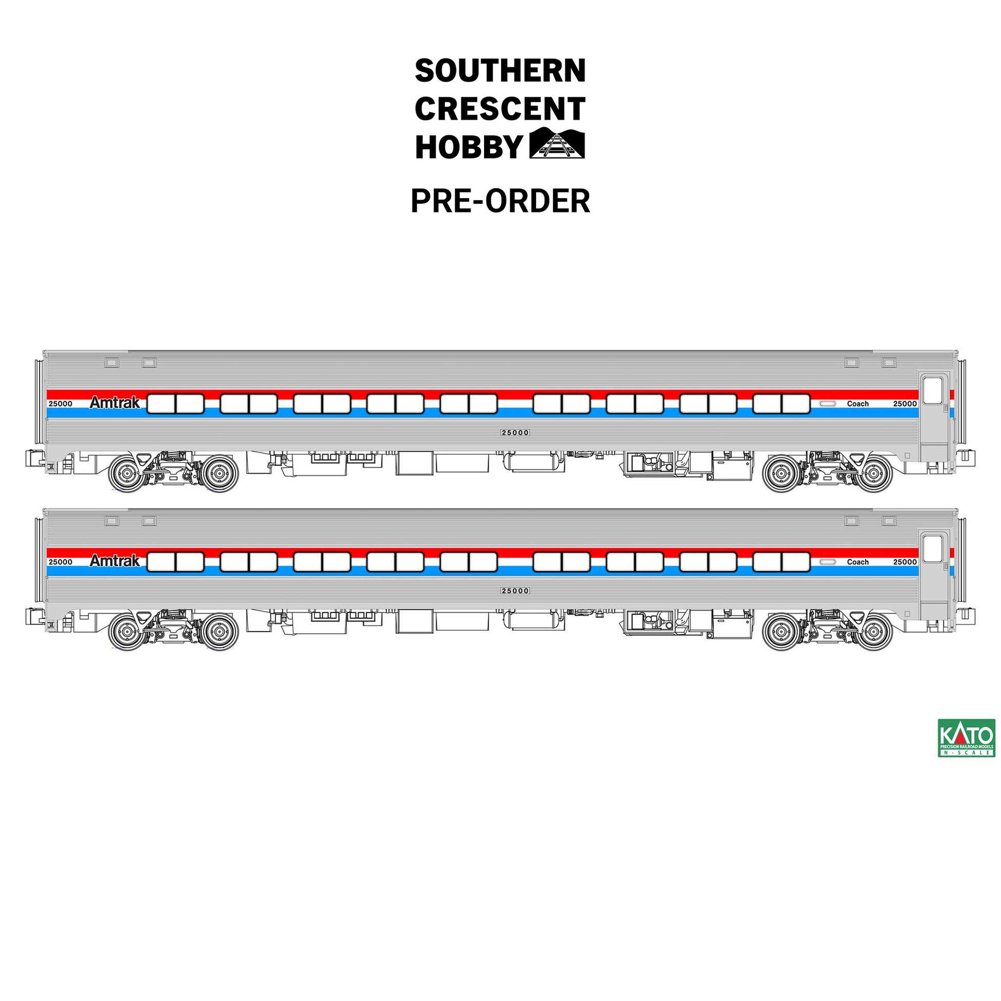 Kato has announced pre-orders for this 2-piece set featuring Amfleet II Coach #25000 and Amfleet II Coach #25068 finished in Amtrak's iconic Phase III livery with equal red, white and blue stripes. These coaches additionally feature factory-installed lighting.