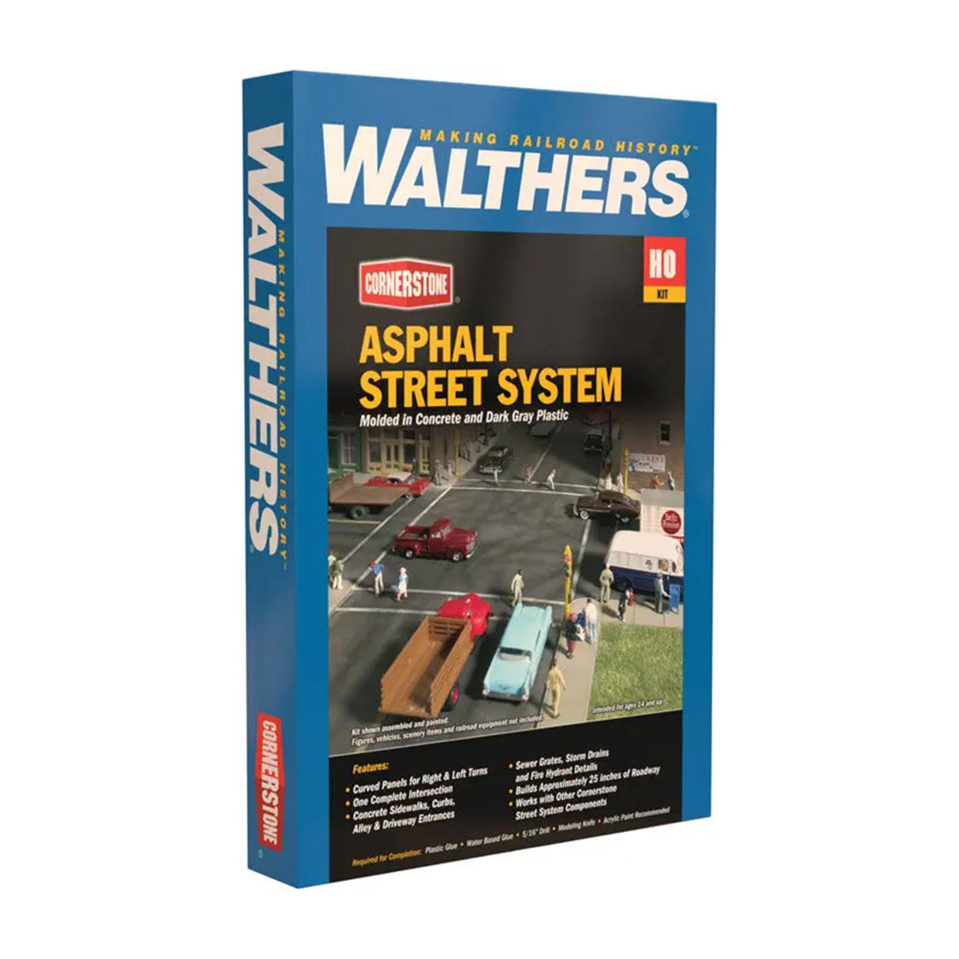 Modeling HO Scale streets is a quick and easy job with Walthers Cornerstone Street System kits. This complete system of detailed plastic parts installs like sectional track; simply glue sections together and add sidewalks, curbs and other details. Street surface is easily painted and weathered to fit your era. Complete Sets (933-3138 Concrete, 933-3139 Brick and 933-3194 Asphalt) include approximately 25" 63cm of roadway, along with parts for one complete intersection, sidewalks, curbs, driveway and alley entrances, plus complete instructions. Additional Cornerstone HO Scale Street System. straight sections (933-3155 Concrete, 933-3156 Brick and 933-3195 Asphalt) are available separately to expand your highway system, each set includes eight straight sections.