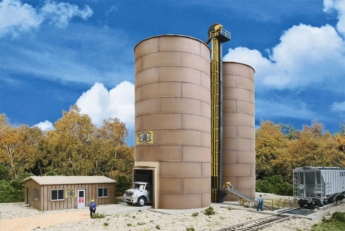 Wherever sand is offloaded, you'll find facilities like the prototype for the Cornerstone Rail-to-Road Aggregate Transfer. One of the newest industries along the rails involves some of the oldest material on earth - sand! While it's been used for centuries to make building materials, glass and metal castings, you'll also find it in paint, fertilizer and plastics. Recently, fracturing sand (or frac sand) has become a hot commodity, used to break rock and improve the flow at new oil and gas fields. But you can't use just any kind of sand for any kind of product, which means it's got to be hauled long distances from producer to end user - a big job tailor-made for today's railroads! Rail-to-Road Aggregate Transfers like this kit can be found at a wide range of industries, where they handle road salt, fertilizer and other granular materials. This complete, easy-to-build kit features twin storage silos with pull-through loading for trucks, main office and guard shack, plus printed company and safety signs. As shown the kit measures: 14-1/2 x 9-5/8 x 11" (36.8 x 24.4 x 27.9cm)