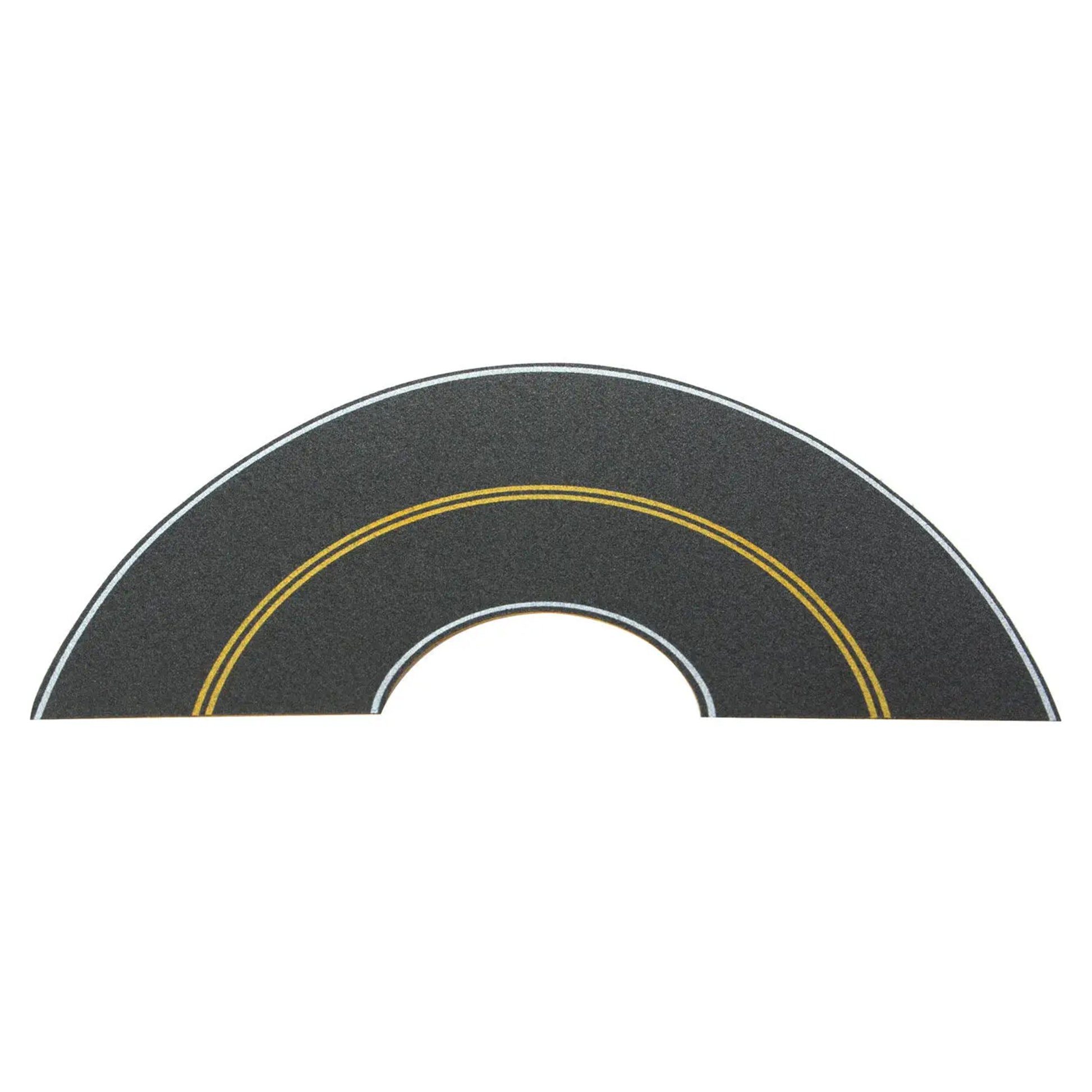 Combine this set of SceneMaster curves with straight sections (each sold separately) to simplify roadway installations in new or vintage scenes. Features solid double yellow centerlines to indicate no passing zone, and solid white edge markings. Easily cut to various sizes. Measures 3-1/8 wide with 9" outside diameter, 80 x 230mm.