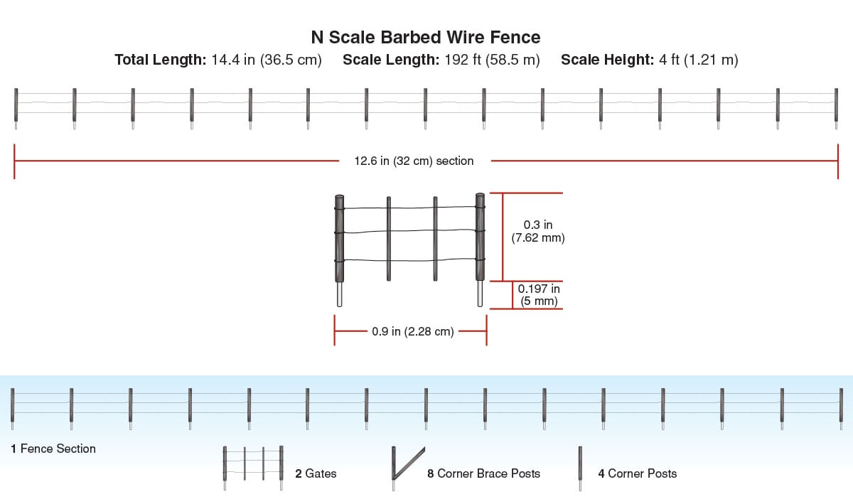 The total length of this fence is 14.4" (36.5 cm), which represents 192 scale ft (58.5 scale m). The scale height is 4 ft (1.21 m).