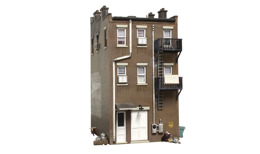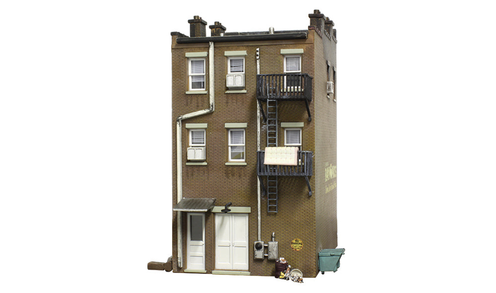 Betty's is a great building to use at the center of an action-packed layout scene. This three-story brick building includes flickering lighting effects that effectively create the illusion of an actively burning building. Custom painting and weathering add the finished touch of a scorched look. There are loads of details and scene-setting accessories, such as signage, a bicycle leaning up against the side of the building, dumpster, wrought iron fire escapes, window treatments and lots more! See photos for footprint.