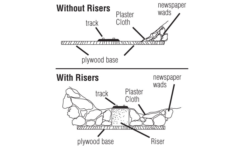 Risers are generally used with Incline/Decline Starters to create varying grades on your layout. Risers are easily flexed to form curves and work on plywood or foam bases. To install, pin in place with Foam Nails and attach with Foam Tack™ Glue or Low Temp Foam Glue Gun and Glue Sticks.