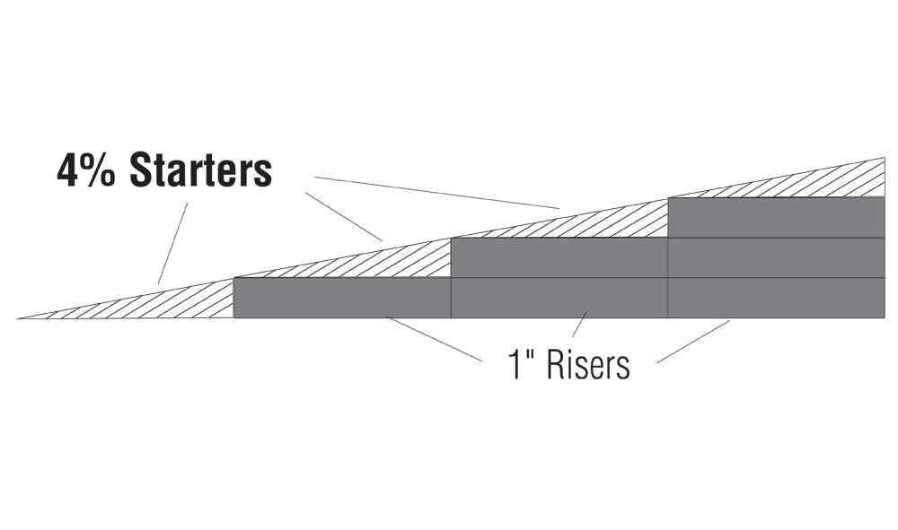 Incline Starters are wedges of high-density foam used to start your track on an incline or decline. Each piece in a package elevates/lowers the track to/from a designated number of inches within a 24" stretch, allowing for a smooth transition from one height to another.