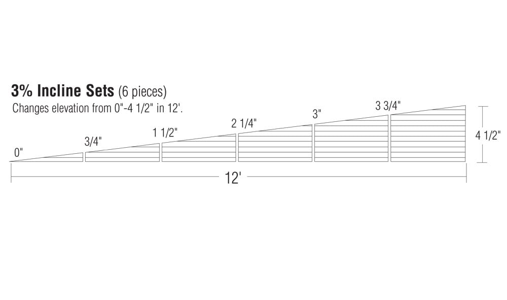 Sets can start an incline at 0" and reach a maximum height of 4 1/2" (11.4 cm). Declines can start at a maximum height of 4 1/2" (11.4 cm) and lower to 0". Actual measurements depend on the grade used.